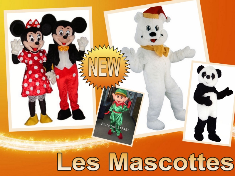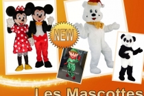 Vous avez le choix entre Mickey et sa compagne Minnie, l'ours blanc, le panda, le crocodile et l'elfe. Chaque mascotte peut avoir une tenue en rapport avec votre thème.
