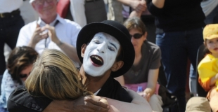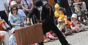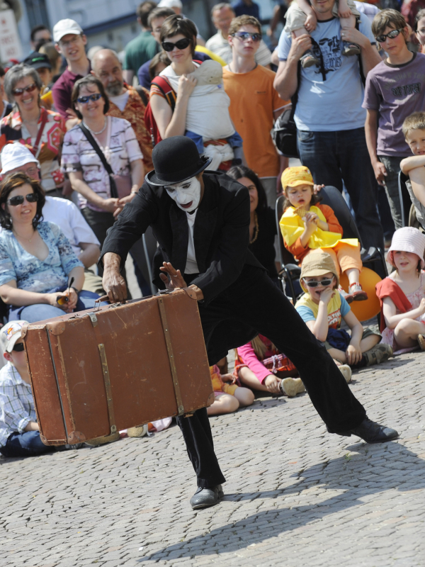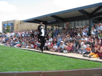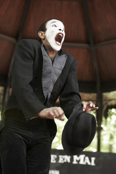 Spectacle de rue interactif de mime fantaisiste sur bande musicale, tout public.