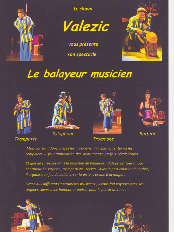 et que de surprises dans la poubelle du balayeur !valezic est tour à tour charmeur de serpent , trompetiste , rocker .avec la participation du public , il organise un jeu de ballon sur la piste , s' essaie à la magie .