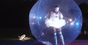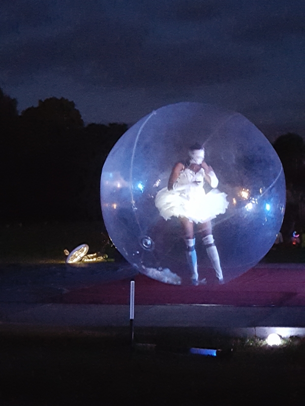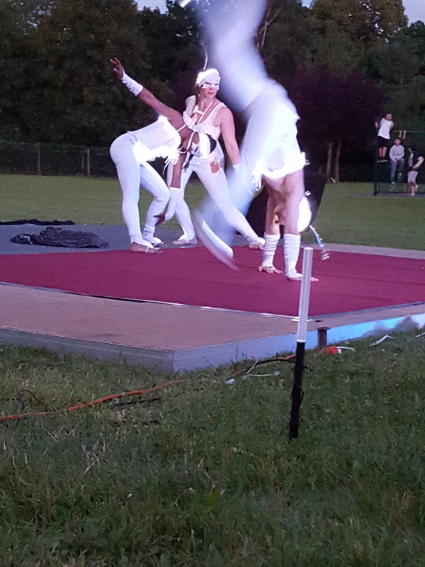 Technique de cirque : Portés acrobatiques en Trio, jonglerie lumineuse, moncocycle, danse, Bulle, cerf volant. Les artistes peuvent apporter d'autres techniques de cirque sur demande.