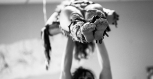Deux déesses immobiles au milieu des convives. les enfants et leurs parents peuvent les observer, les approcher. Telles des statues vivantes, elles s'animent petit à petit. Elles dérivent lentement et acrobatiquement jusqu'à faire fusionner leurs deux corps. Puis les acrobates invient grands et petits à profiter d'un numéro de portés acrobatiques avant de proposer un atelier parent/enfant.