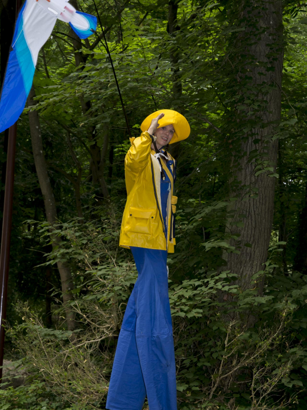 L'échassier pêcheur, bordé dans son ciré jaune, Léon appâte les badauds on leur proposant des acrobaties sur échasse. désespérée par la pollution, il jette une bouteille à la mer en échangeant des nœuds marins contre des papiers souillés. Pour lui , tous les temps sont bons pour écumer les sourires !