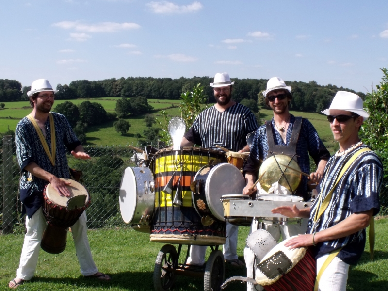 Riches de trouvailles, leurs arrangements originaux font se croiser les reïtas et bendhirs du Maroc, les tambours et cloches du Brésil, djembés et doundouns d 'Afrique de l ’Ouest. Avec énergie et joie vivre, ils enchantent les lieux et propagent l’envie de danser.