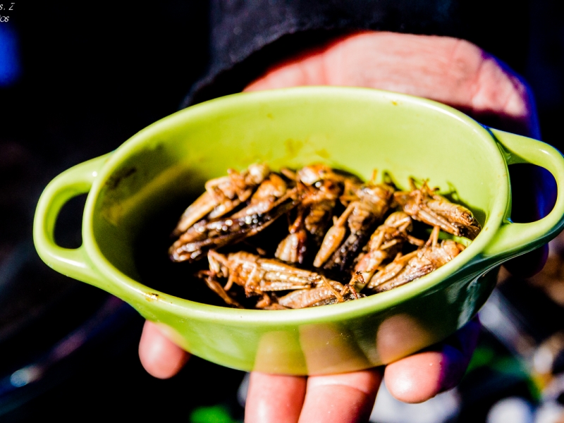 Nous vous proposons une dégustation (Grillons, criquets, vers de farine cuit sur place.