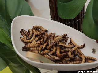 Préparation d'insectes cuits puis grillé sur une plancha pour garder toutes les vitamines de l'insecte, grillons caramélisé, vers de farine salés, etc...