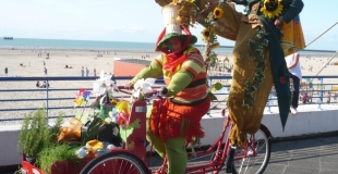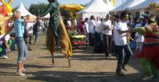Artistes : 1 échassier comédien/danseur et 1 comédienne au sol avec son triporteur tandem sonorisé.