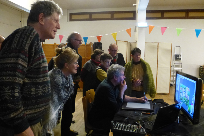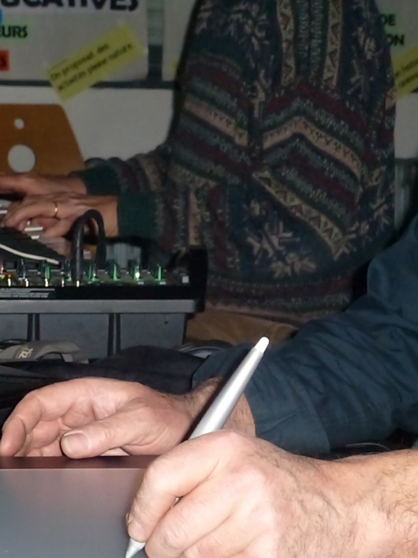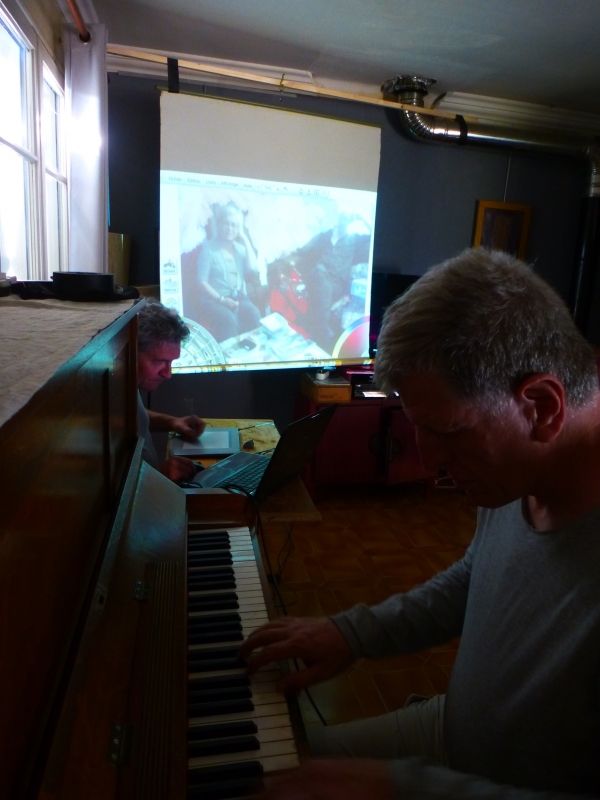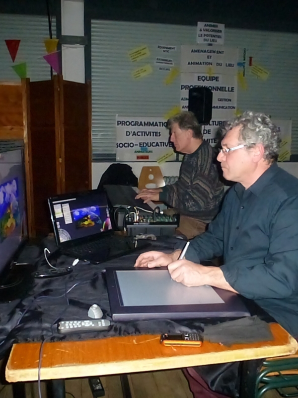René BRION improvise au piano sur trois thèmes différents tandis que Michel GRENET inspiré par ses notes réalise une peinture projetée sur écran, entraine la musique vers d'autres rythmes puis la peinture vers d'autres rivages jusqu'à l'oeuvre aboutie.