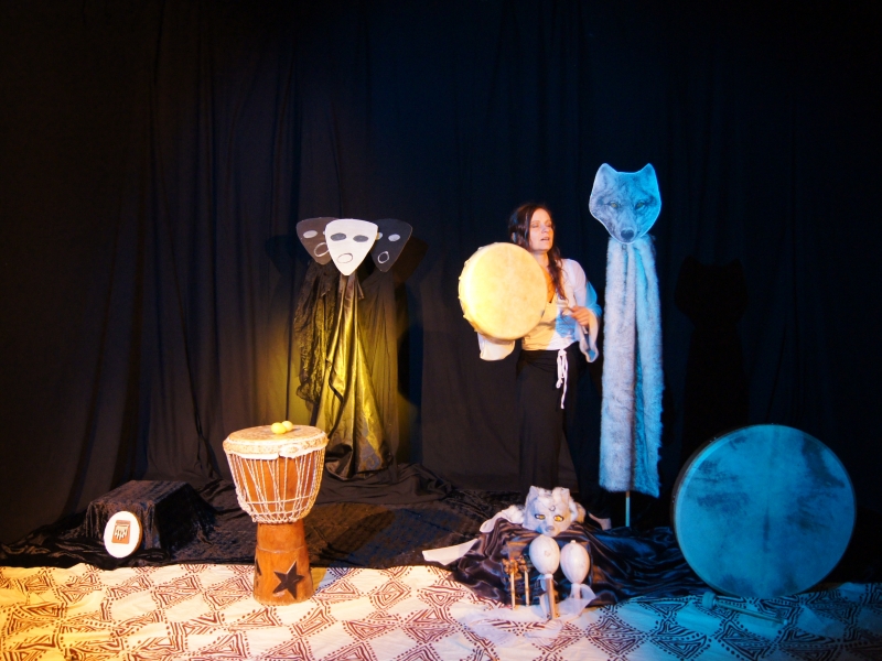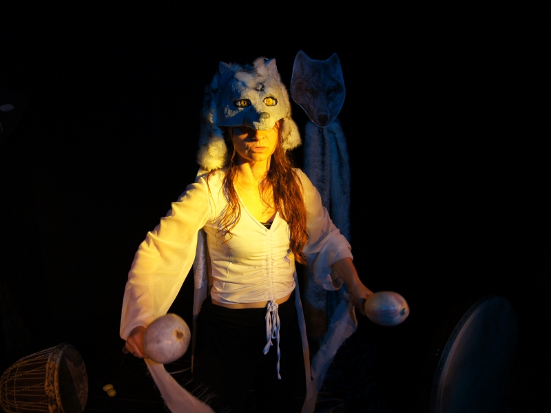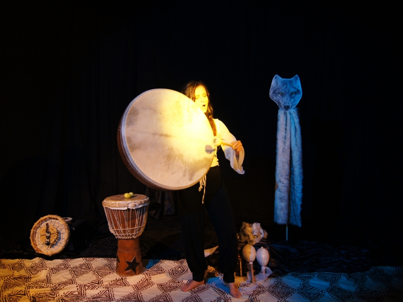 Le chant, le rythme du djembé et des hochets, les ambiances sonores, la vibration du tambour rythment le récit pour donner vie à la louve sauvage.