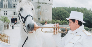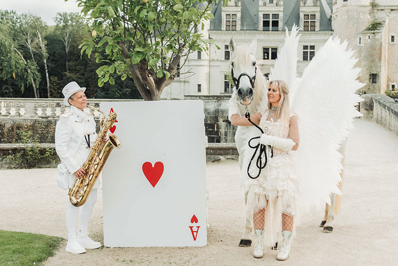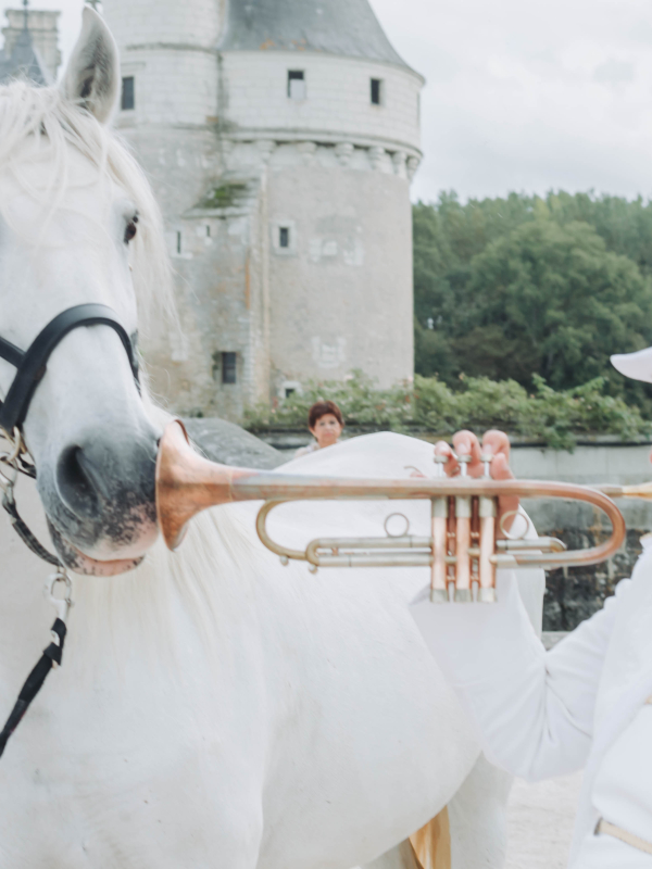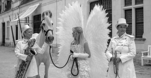 Spectacle à 4 artistes : Une cavalière, une trompettiste, une saxophoniste et un cheval, se joue en plein air ou en manège.