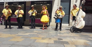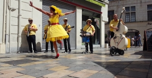 Swing New Orleans le spectacle New qui est présenté avec une chanteuse et une Contrebasse ainsi que Banjo, cuivre et caisse claire en déambulation ! et sonorisés graçe au système de sonomobile de la Compagnie Swing'n'Soul.