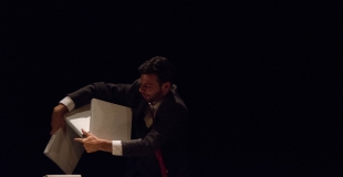 Il fait un travail jonglé, répétitif et absurde, ses gestes carrés et précis deviennent au fur et à mésure chaotiques et violents, ses lancées tordent son corps et le jettent à travers l'espace scénique, jusqu'à l'épuisement totale.