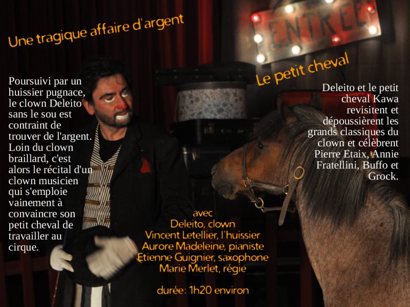 Poursuivi par un huissier pugnace, le clown DELEITO, sans le sou est contraint de trouver de l'argent. C'est alors le récital d'un clown musicien qui s'emploie vainement à convaincre son petit cheval de travailler au cirque.