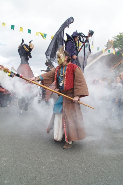 Evocatio, de l'ombre à la lumière : Spectacle nocturne en fixe de 40 minutes en option dans un décor fantasmagorique, avec conte et théâtre, danse et musique, échasses et pyrotechnie.
