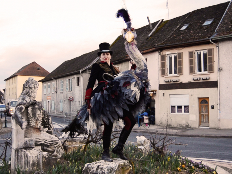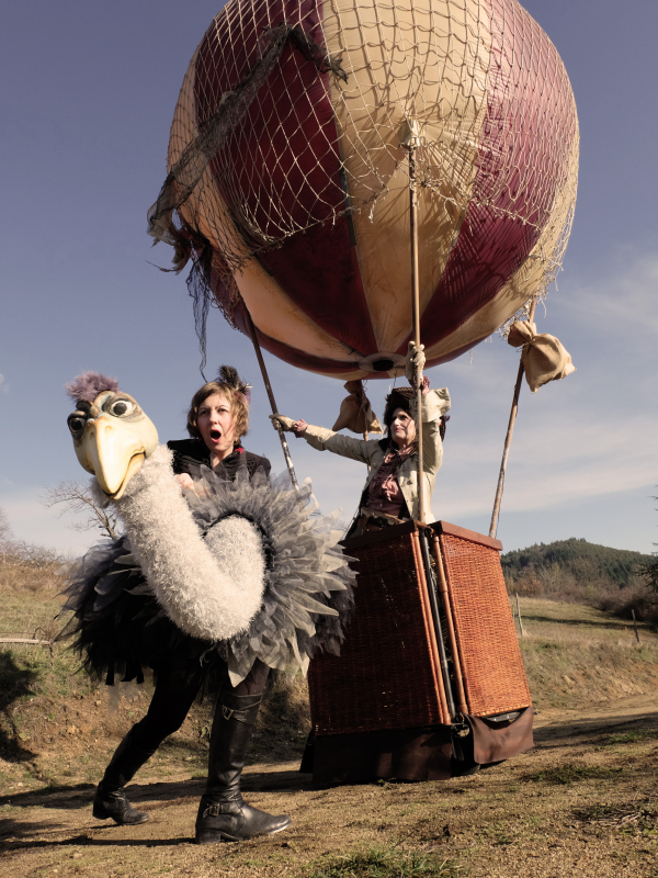 Mme De Dégonflé atterrit à bord de son engin dirigeable en terre inconnue, Ornithologue et exilée climatique, elle cherche son chemin avec l’aide des spectateurs.