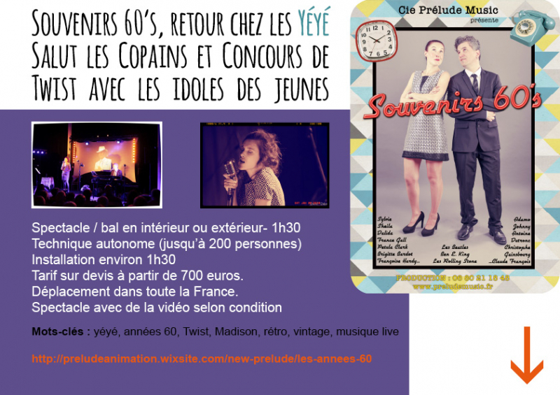 La Cie Prélude Music a choisi de vous présenter ce spectacle vintage dans un décor épuré. Le show est accompagné de vidéo et le public est invité à danser et chanter les refrains éternels des idoles des jeunes. Au programme, Johnny, Sylvie, Sheila, France Gall, Adamo, Claude François, Christophe, BB, Françoise Hardy, Jacques Dutronc mais également les groupes et stars d'outre manche, The Beatles, The Rolling Stone et même des Etats Unis, Elvis, Ben E. King, Chubby Checkern Janis Joplin...