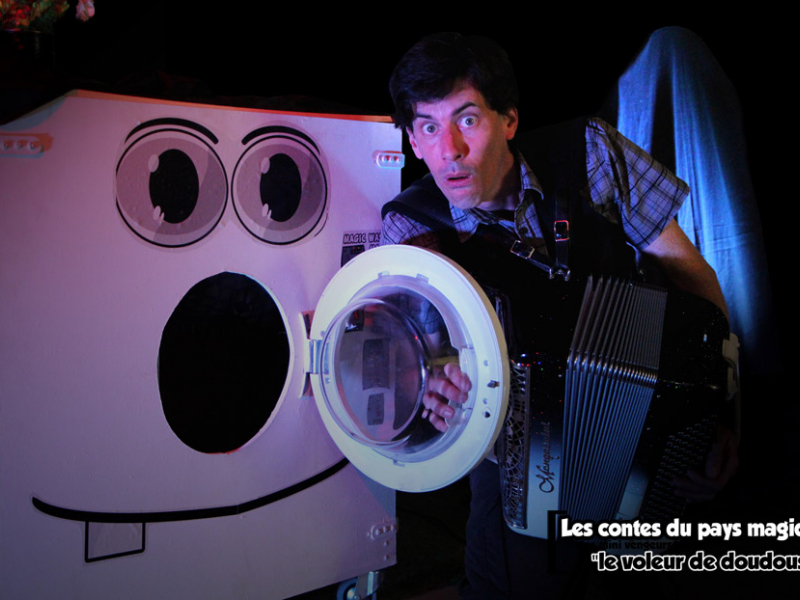 Hérité des concerts à succès des Mini Vengeurs (cf fiches), la compagnie du Vengeur a mis sur pied en 2016 un spectacle unique à mi chemin entre le conte, le concert et le théâtre participatif prénommé les contes du pays magique: "le Voleur de doudous"
