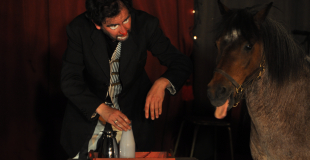 Joyeux Noël Monsieur Deleito avec Pascal Sanchez clown musicien, Vincent Letellier, jongleur et Kawa, poney
