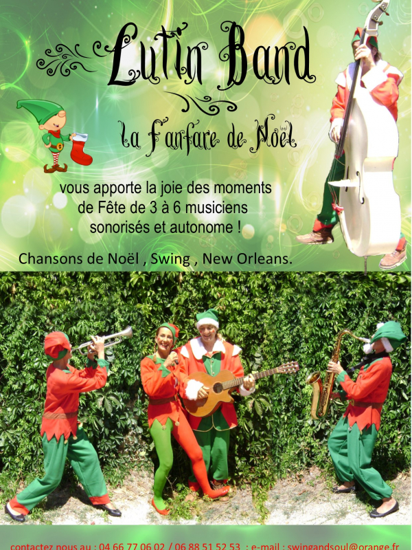 Lutin Band la nouvelle création de la Compagnie Swing'n'Soul idéal pour toutes les animations de Fetes de Fin d'année. De 3 à 6 musiciens avec une chanteuse / danseuse les joyeux lutins envahissent les rues et Marchés de Noel avec leur musique festives de chansons de Noel , swing et" New ". Leur musique joué en live, sans séquences, enchante le public et les petits et grands sont vite entraînés dans ce tourbillon de chansons qui swinguent et qui vous apporte la bonne humeur !