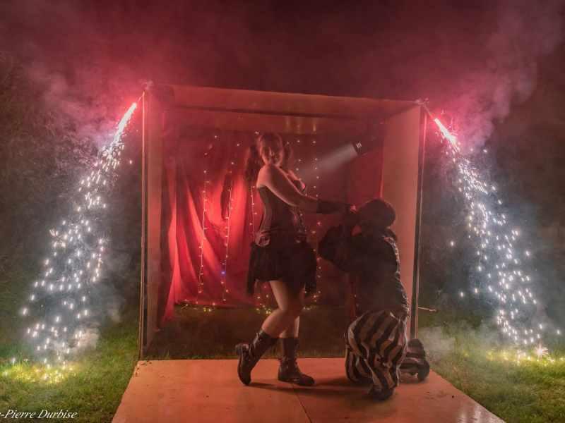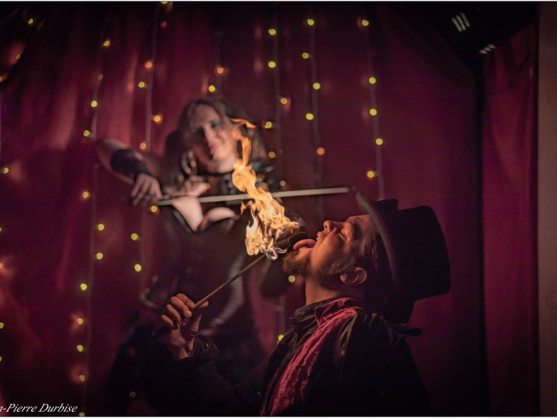 Un duo mélangeant poésie, humour, musique live, musique électronique, arts du feu et pyrotechnie.