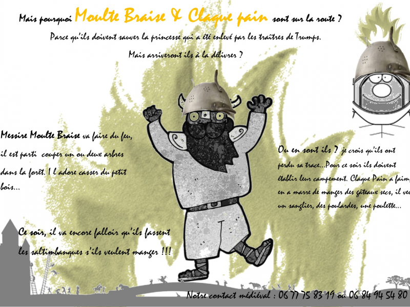Pour ce soir ils doivent établir leur campement. Claque Pain a faim, il en a marre de manger des gâteaux secs, il veut un sanglier, des poulardes, une poulette...Messire Moulte Braise est particouper un ou deux arbres dans la forêt pour faire du feu. Il adore casser du petit bois...Ce soir, il va encore falloir qu’ils fassent les saltimbanques s’ils veulent manger !!!