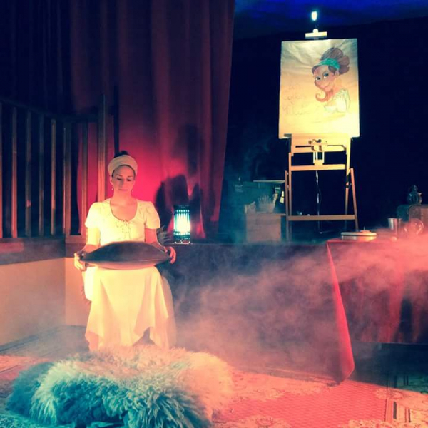 Elle vous contera l'histoire de Gildas Tête de bois, parti à la conquête d'un trésor et qui devra affronter les épreuves de lutins, dragons et autres géants. Elle vous enchantera avec la légende du petit roi qui décida une nuit d'hiver de couper tous les arbres de la forêt. Laissez vous emporter par ses instruments merveilleux ( hang, flûtes en cornes, étranges percussions ) et les illustrations de Sténo qui illustre en direct ses légendes.