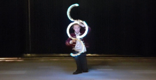 Max repousse les limites de cet agrès original en créant une infinité de formes géométriques qui s'assemblent et se divisent tels des fractales, qu'il fait serpenter sur son corps et dans l'espace dans une attitude autant martiale que gracieuse.