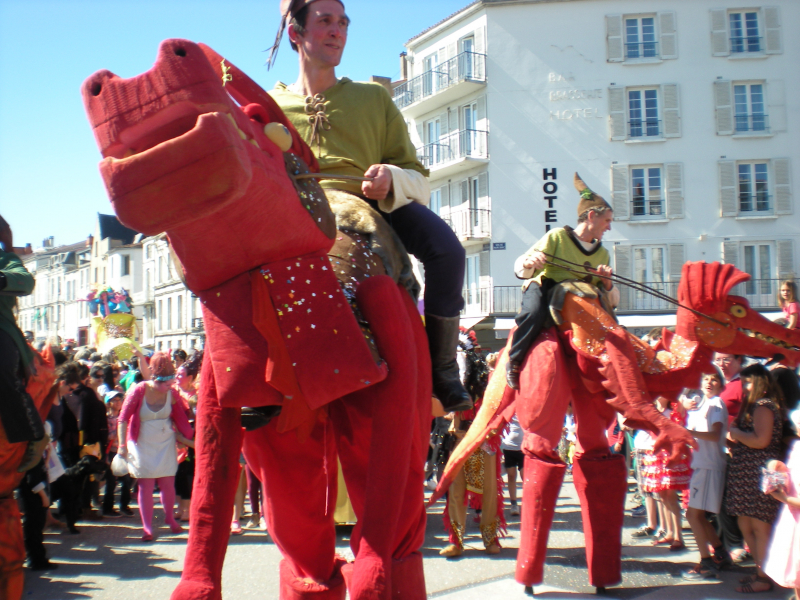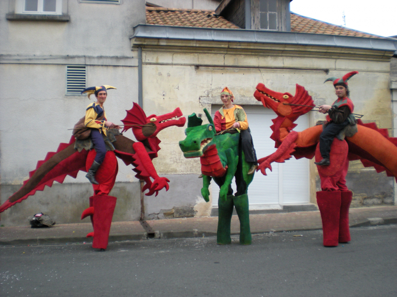 les Nouveaux Saltimbanques vous présentent leurs Dragons manipulés par des échassiers. D'une longueur de 4 m, très joueurs ils ne passeront pas inaperçue. Conçues en matière douce, ces dragons permettent de jouer avec le public au plus prêt. Montés par leurs nains farceurs, l'illusion bluffe plus d'une personne . C'est avec grand plaisir que ces nains dressent leur dragon a semer la zizanie dans la foule, nombreux seront les enfants et parents croqué par ses jeunes dragons turbulents .C'est notre animations phare pour les carnavals , riches en couleurs et visible de loin .Rires et sourires garantie ...