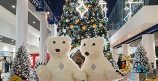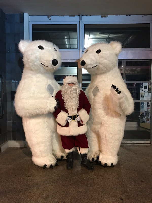 Les Ours Polaires géants, doux et généreux. Un spectacle déambulatoire d'ours polaires visuel et modulable, de 3 à 5 artistes comédiens.