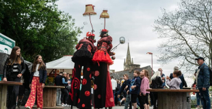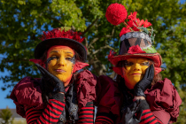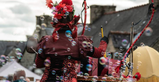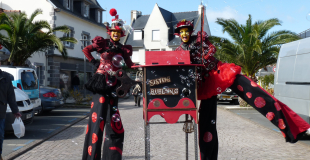 Spectacle déambulatoire avec 2 échassiers, une chariote et une multitudes de bulles. S'adapte à tout évènement festif. En raison du produit à bulle , déambulation en extérieur.