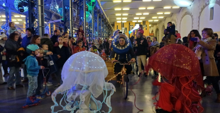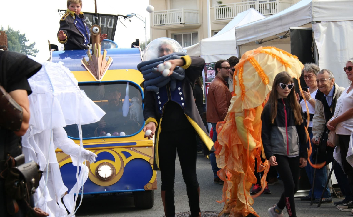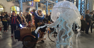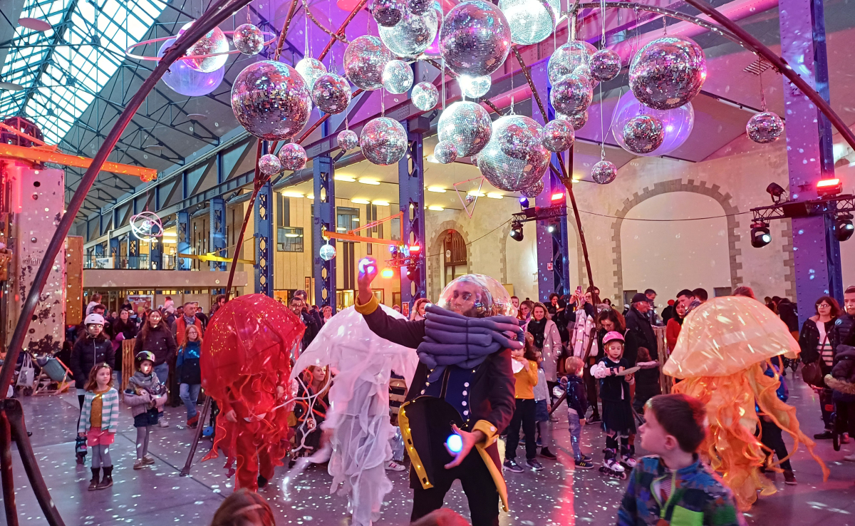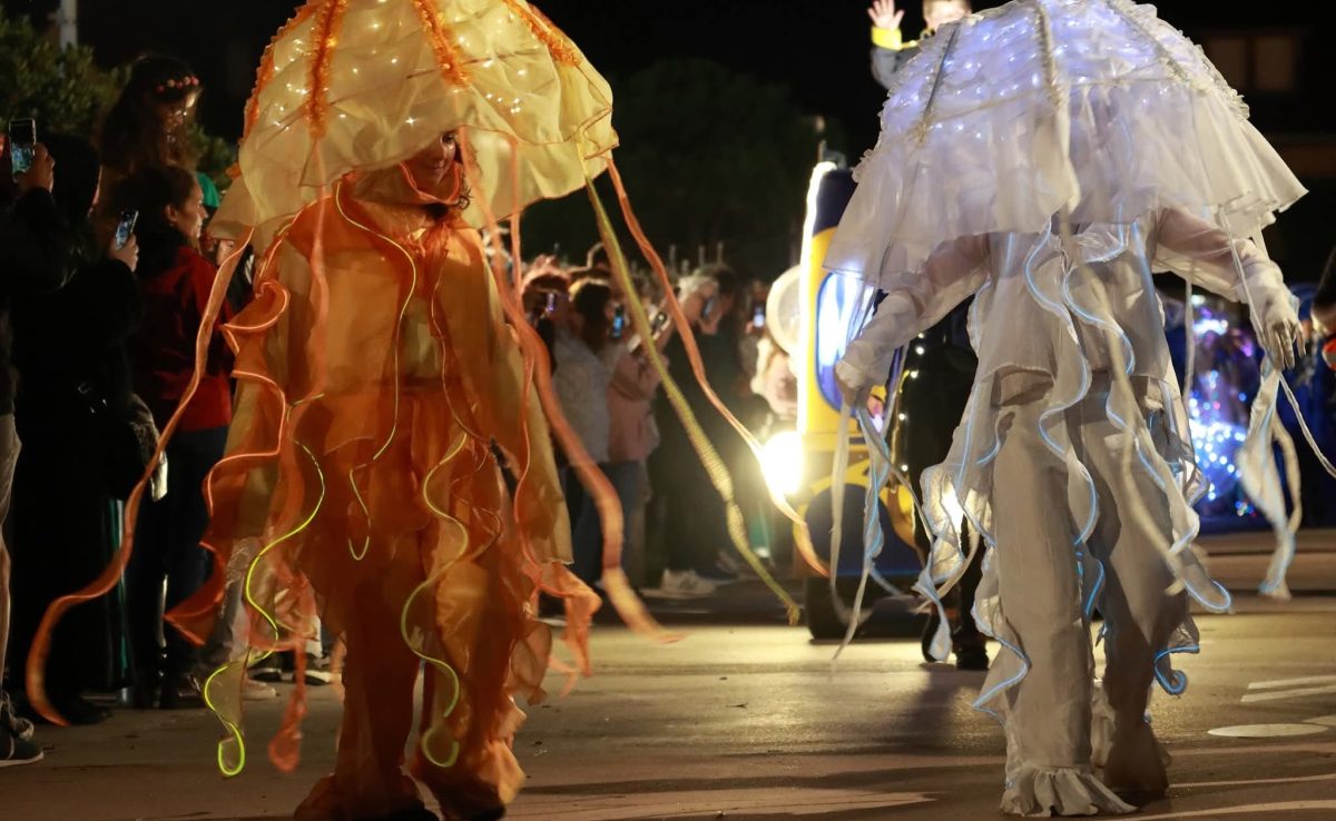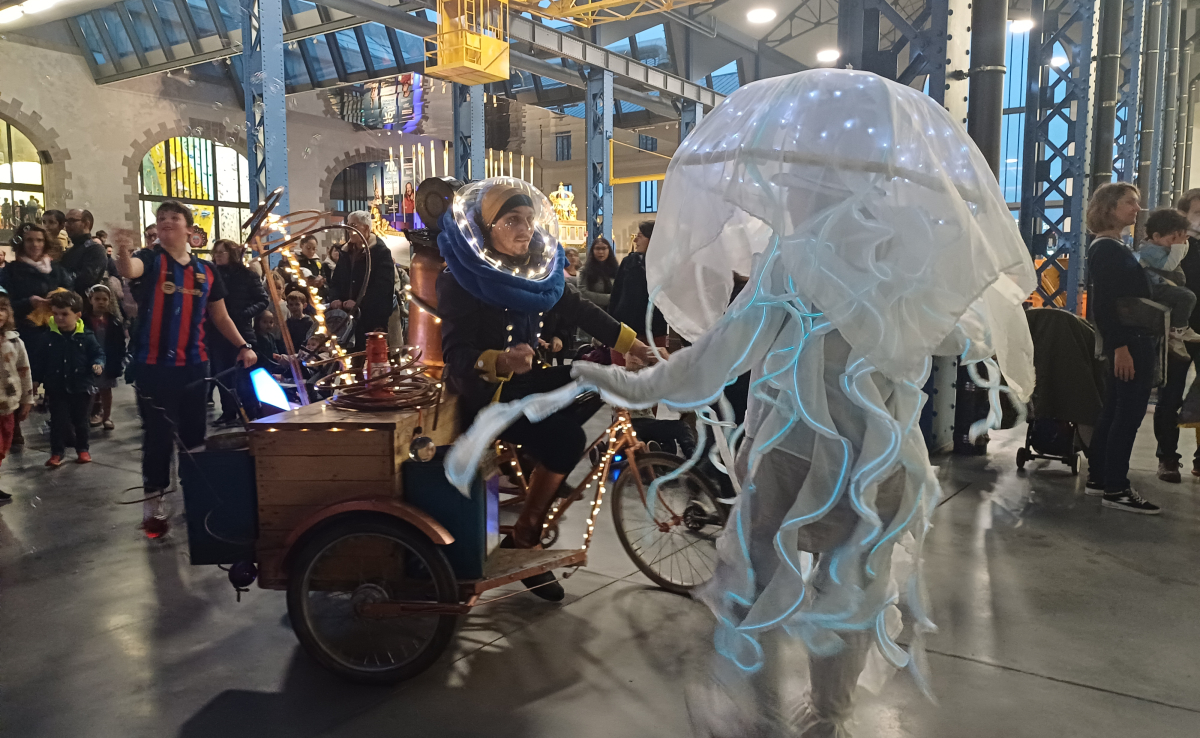 Au fil du cortège, d’élégantes méduses humaines ondulent au rythme des courants, certaines flottant sur échasses, d’autres glissant au sol dans une chorégraphie hypnotique. Autour d’elles, des jongleurs-scaphandriers, manipulateurs de bulles et de lumière, animent l’espace avec grâce et poésie.