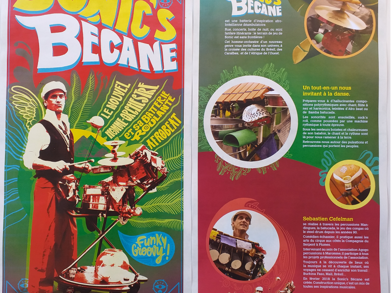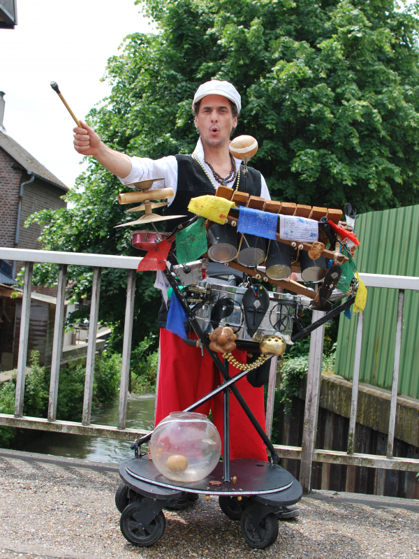 Un des objectifs principaux de cet homme orchestre est de proposer un spectacle interactif et métissé dans lequel le public sera sollicité pour le chant, la danse, afin d’être acteur dans un voyage initiatique, ouvert aux différentes cultures du monde.Cette batterie des percussions africaines et brésiliennes mêlant bois et métal mais aussi parce que les cultures traditionnelles (culture mandingue, samba etc.) se mettent au service de la musique actuelle.