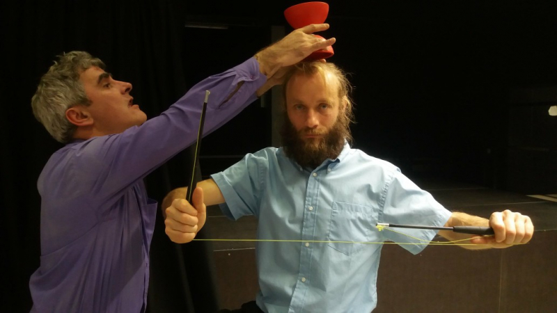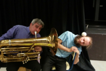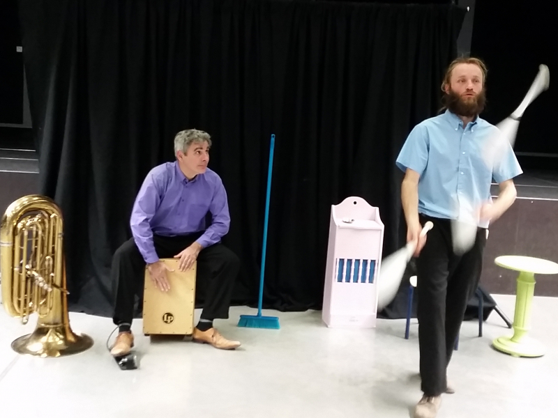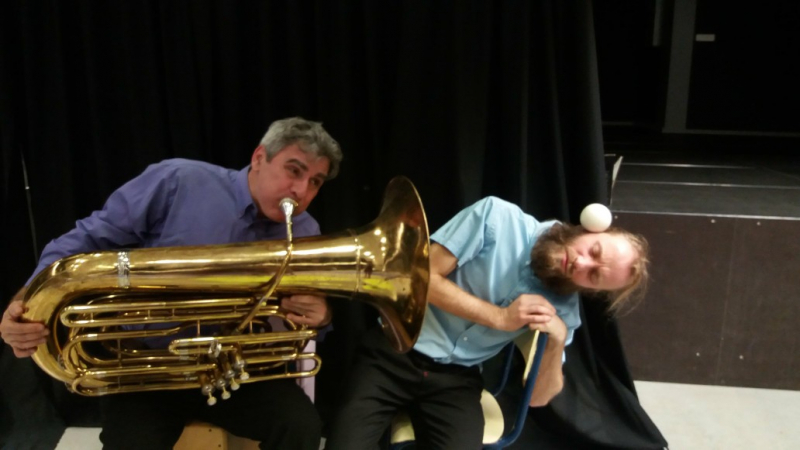 Spectacle interactif où les enfants s'émerveillent des performances circassiennes, sont impressionnés par l'imposant contre-tuba, et surtout, rient beaucoup des facéties de ces deux filous.