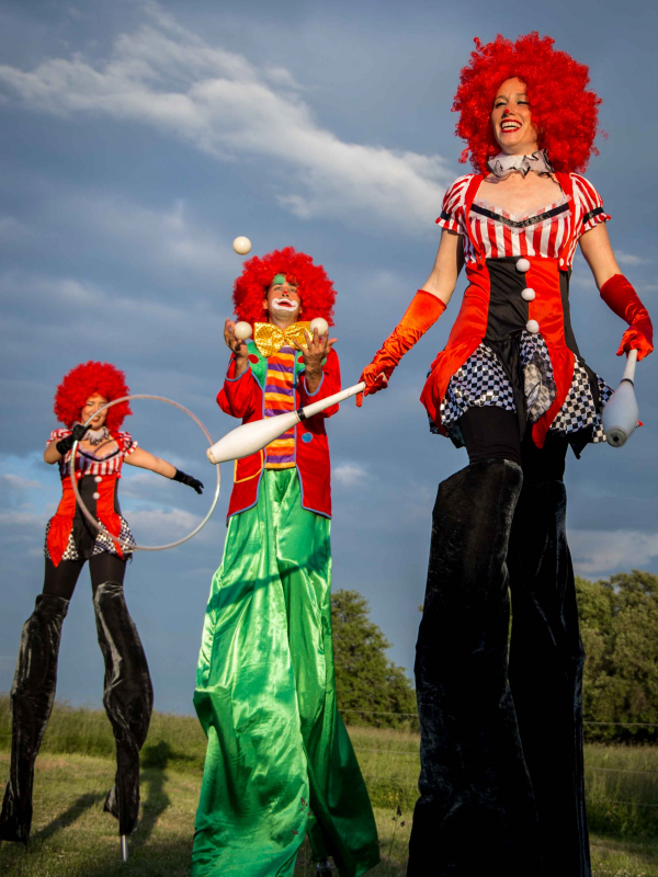 Cette parade est composée de d'un clown et de deux clownettes sur échasses qui peuvent être accompagnés par d'autres artistes en déambulation au sol ou sur monocycle. Ces derniers sont soit jongleurs soit acrobates.