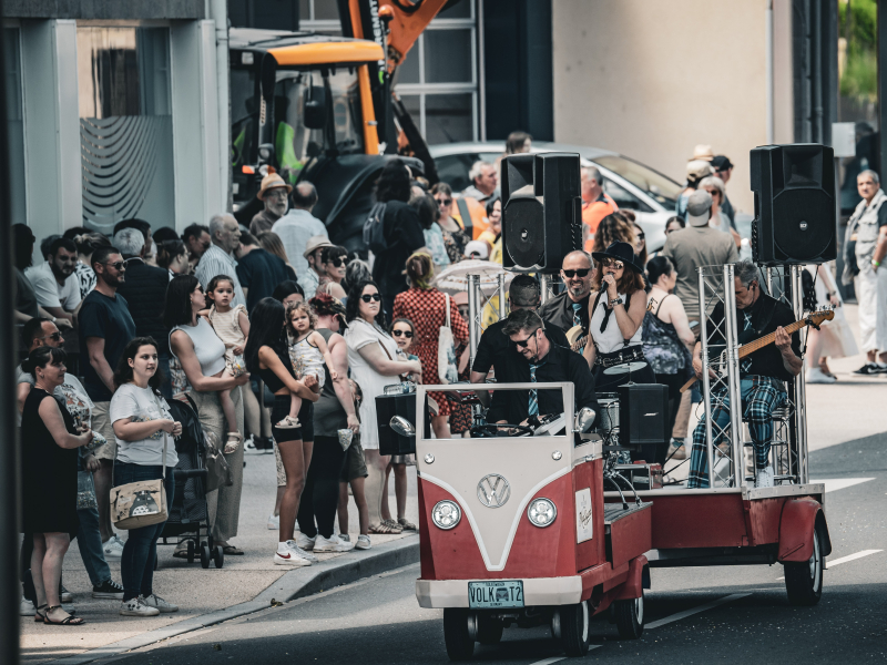 Un orchestre déambulatoire dans vos rues, sonorisé grâce à notre concept "la MobilScène", une scène mobile entièrement autonome tractée par un mini-camion électrique au look "vintage" avec sonorisation et éclairages.