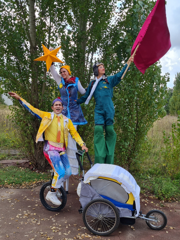 -Surprise Onirique et poétique avec les personnages inspirés du livre Le petit prince : l'aviateur, Petit Prince, M. Soleil forment une troupe onirique prêt à prendre de la hauteur pour communiquer avec les habitants de la planète terre. pour mieux délivrer leur message d'amitié, il snh'ésitent pas à défier les lois de la gravité.