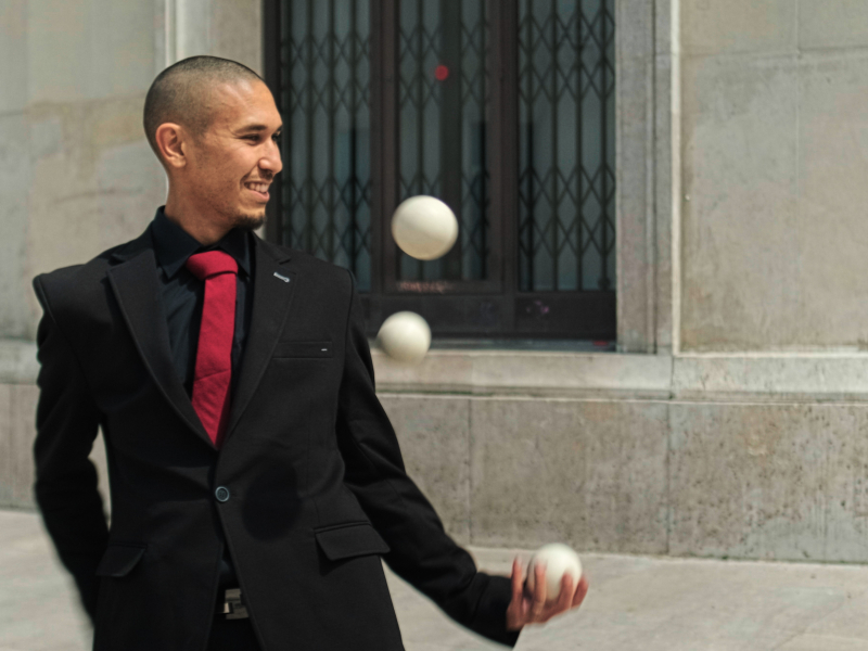 Cette déambulation de jonglage vous en mettra plein les yeux grâce à des jongleurs élégants et performants. Maîtrisant tous plusieurs agrès, ils peuvent jouer en déambulation totale ou réaliser des fixes afin de créer l'événement. Vous verrez balles, massues, ballons ou staffs virevolter avec brio dans les airs. A plusieurs, ils jongleront de manière chorégraphiée et percutante. En visuel ou en interaction avec le public, ils créeront avec humour des moments uniques et mémorables dans la pure tradition de l'art de rue. Cette animation originale et raffinée remet au goût du jour les arts du cirque et la jonglerie en y apportant une touche de modernité.