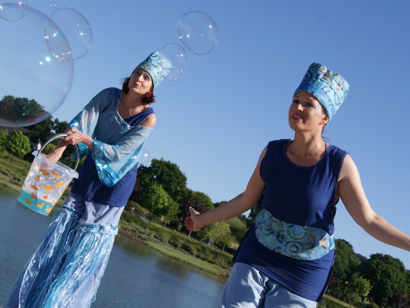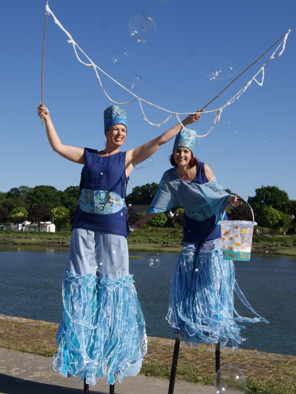 Océan de bulles est une déambulation artistique et poétique menée par des personnages évoluant sur échasses : Cyan et Saphir. Elles sont à la recherche de l'horizon, là où la mer rejoint le ciel.