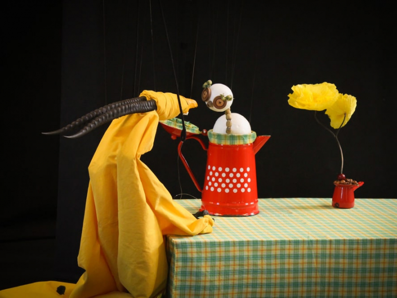Le conteur-marionnettiste fait intervenir à tour de rôle 2 marionnettes à fils très différentes l'une de l'autre. Autant l'une est ronde et petite, autant l'autre est grande et colorée. Il raconte leur vie quotidienne, du matin jusqu'au soir, toute simple. Puis, à un moment donné, les 2 marionnettes se rencontrent et là, c'est une autre histoire qui commence...