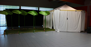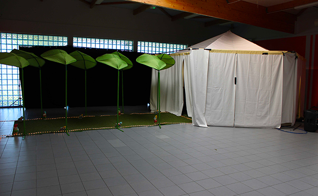 Rikiki Minus » installe le public au sein d’un kiosque, sur un tapis d’herbe. Tout autour de lui, la vie, en un cirque d’objets, des marionnettes, au rythme d’une journée dans les herbes vertes.