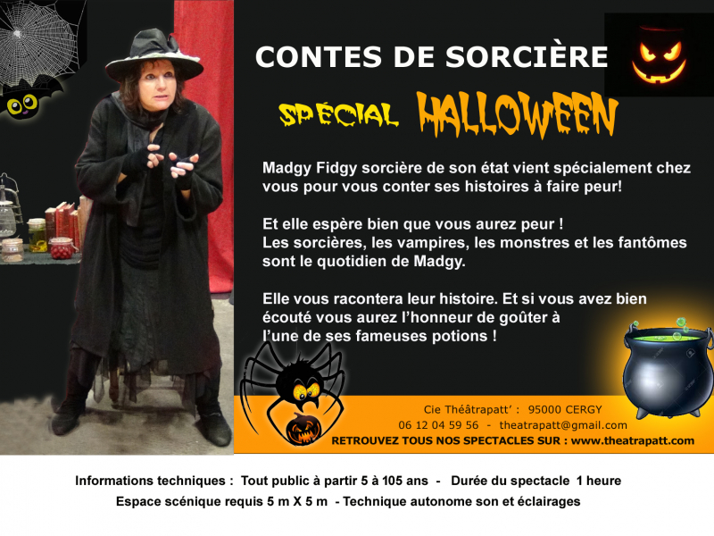 La sorcière Madgy Fidgy venue auprès des humains, rapporter les histoires de ses ancêtres peu recommandables. Dans un décor qui représente la maison de Madgy. Des récits de sorcières, de monstres, de fantômes, de quoi vous faire dresser les cheveux sur la tête.