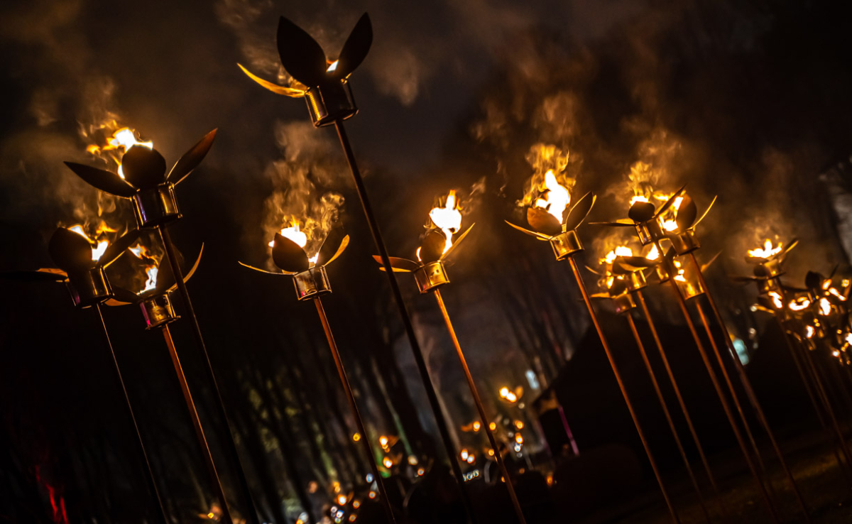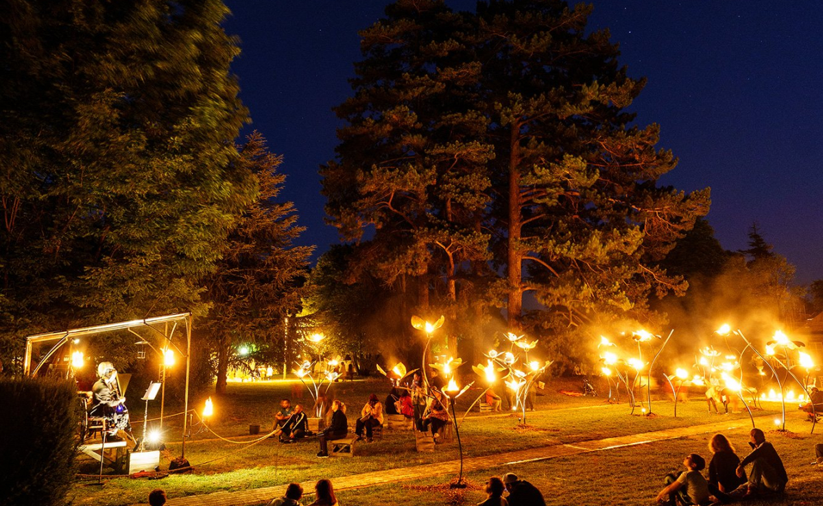 Une Installation de feu : un jardin qui se dessine au milieu d'une scénographie de sculptures de ferrailles ardentes...