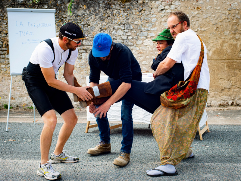 La Dermotoculture se présente comme une véritable conférence derrière laquelle se cache un spectacle de rue déjanté. Rapidement les frontières entre la scène et le public s'effaceront pour laisser la place à des personnages hauts en couleur qui nous rappelleront l'importance de l'écoute dans un monde où la pluralité des points de vue est souvent source de frictions... et de rires !!!