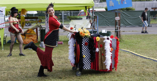 Cette prestation peut se faire entièrement en déambulatoire ou alterner avec des pauses sous formes de petites scénettes dansées et jonglées.