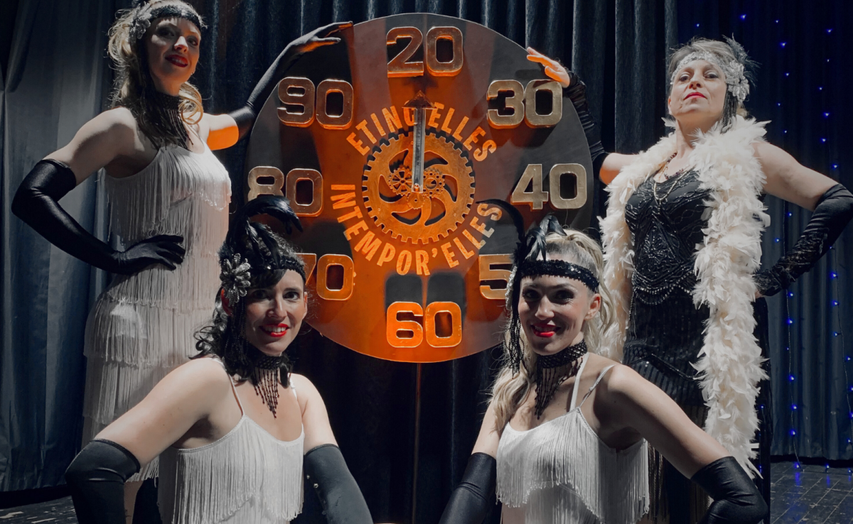 Etinc’elles vous entraine dans un périple musical où ses chorégraphies et ses costumes seront votre moyen de transport pour revivre les rythmes musicaux festifs du passé !