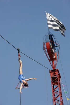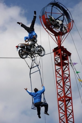 La famille STEY joue les équilibristes sur un simple câble à trente mètres de hauteur. A pied ou à moto c'est dans la pure tradition funambulesque que ces artistes se produisent sans filet ni ceinture de sécurité.