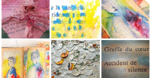 A travers la couleur de la peinture ou des pastels, je propose un atelier créatif sur le recyclage du livre usé par différents techniques : l'écriture intuitive, la couture, la peinture, le dessin, le collage, la broderie des mots....pour tous publics.