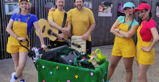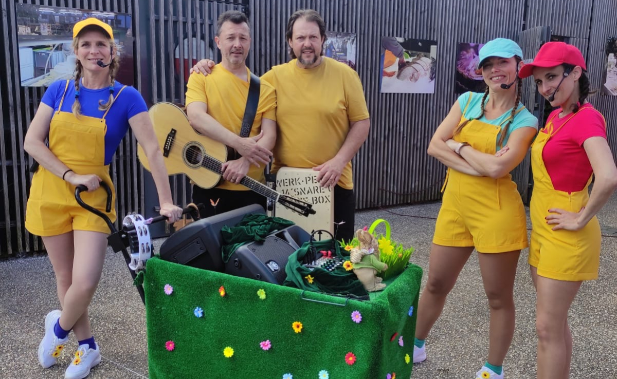 3 chanteuses, 2 musiciens, en déambulation avec sonorisation autonome dissimulée dans un chariot à la décoration printanière, mais aussi en version concert.