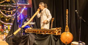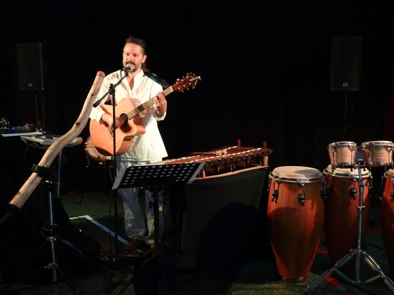 Sur scène le musicien s'accompagne de différents instruments de musique: Balafon, Guitare, Didgeridoo, Djembé, Kalimba, Congas, Océan Drum, Tamborim, Handsonic, Guimbarde ...