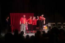 Le thème donné par le public : l’école. Un enfant volontaire vient avec nous dans la classe. Tous ont peur de la maitresse qui va faire une dictée. La maitresse arrive en hurlant, ils tremblent et se cachent derrière leurs chaises. La dictée commence. En guise de stylo les enfants ont une raquette…