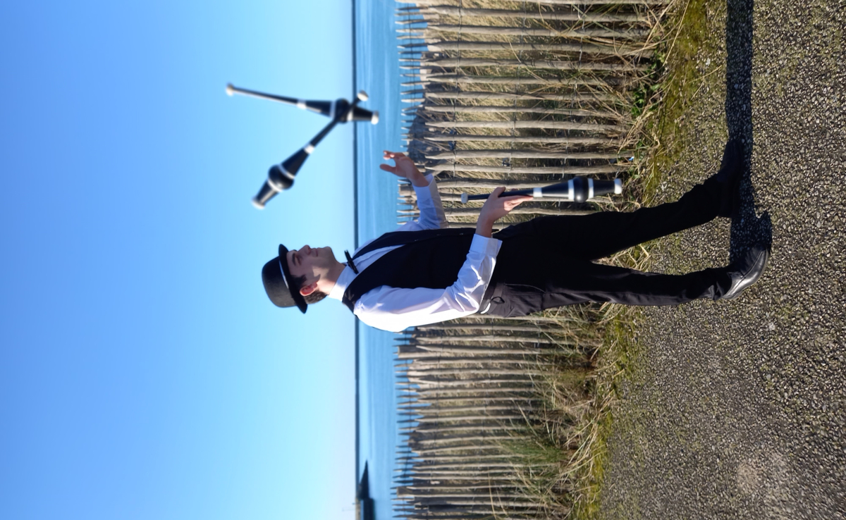 Massues, sabres, torches enflammées… tout virevolte dans un véritable ballet aérien, porté par l’énergie et la joie de vivre de ce jongleur hors du commun. Chaque lancer, chaque rattrapé devient un moment spectaculaire où précision, rythme et maîtrise se mêlent pour captiver les regards.